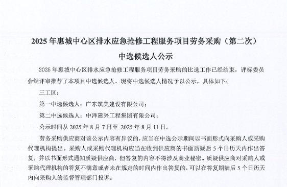 惠州市增江龍門段治理工程施工(一標(biāo)段)勞務(wù)采購中選候選人公示……